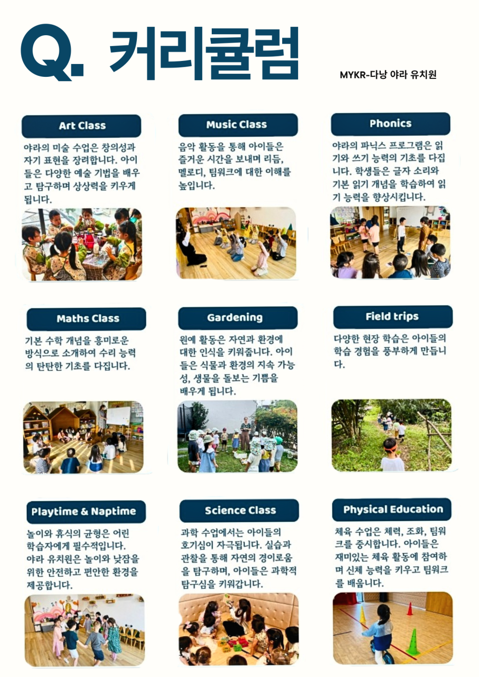08:30 ~ 11:00 오전 집중 수업 (영어, 파닉스, 수학, 과학 등)