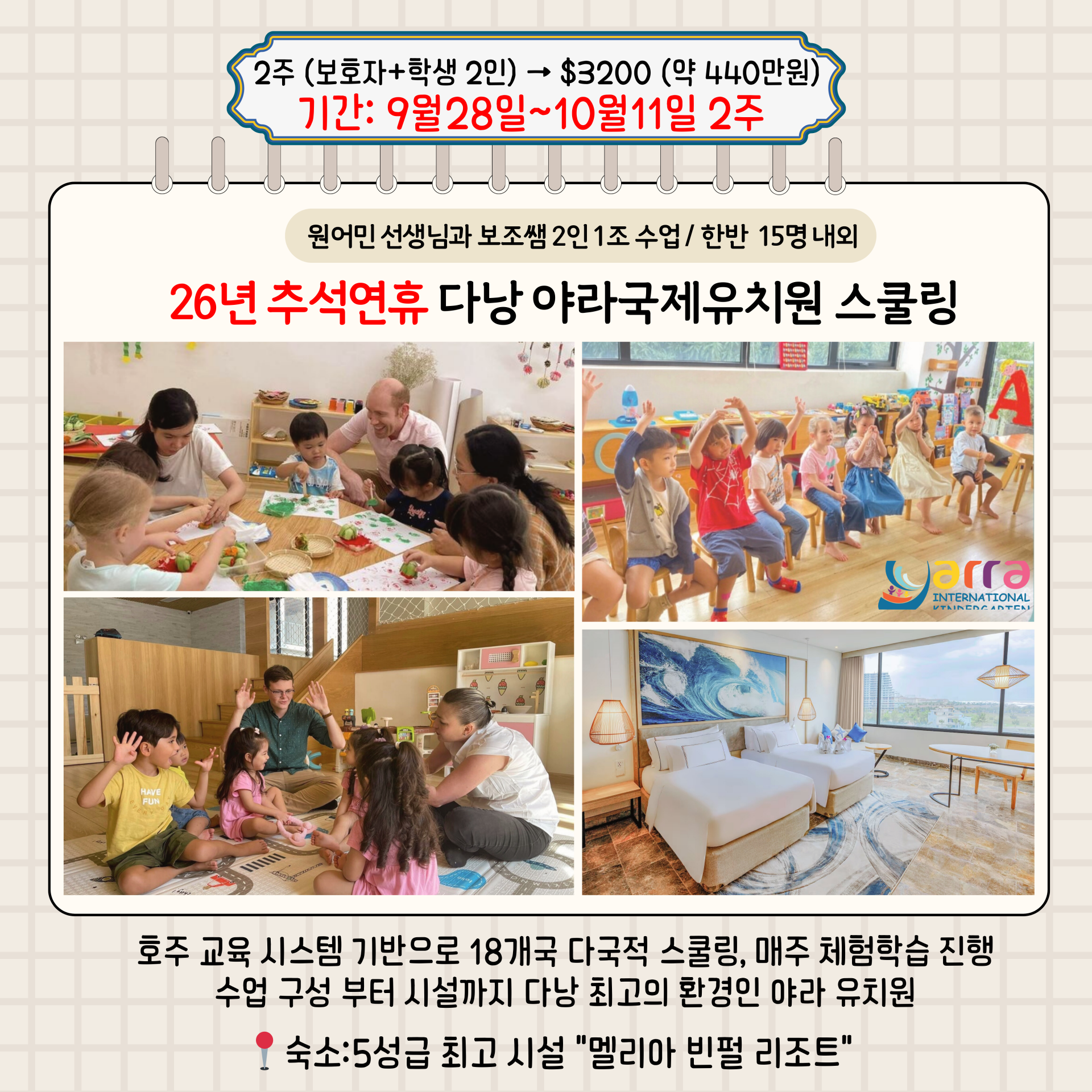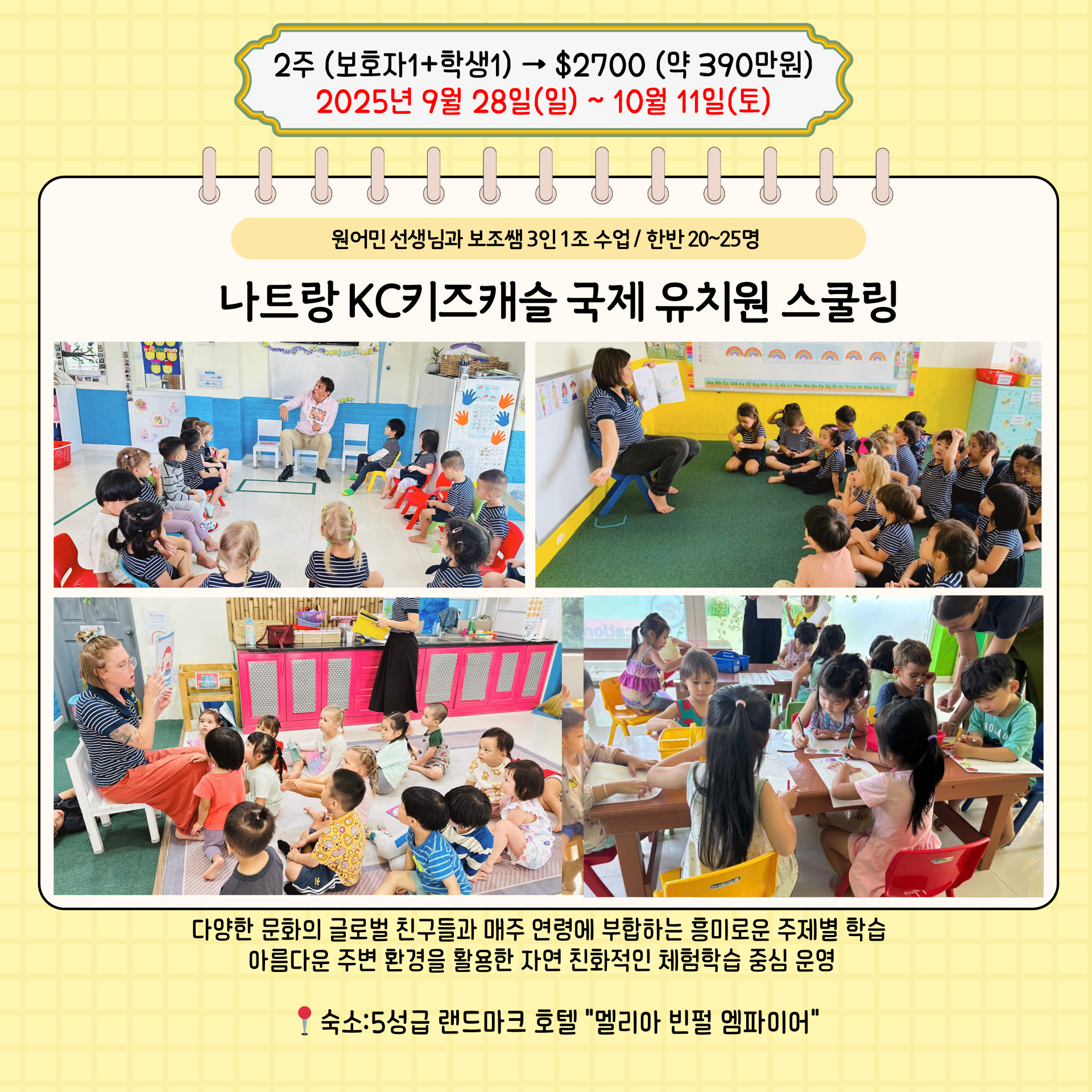 5성급 호텔과 국제학교를 연계해 운영되며, 영어캠프가 처음인 유치원생부터 초등학생, 중학생까지 모두 참여할 수 있는 구조입니다.