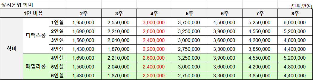 1. 비수기 : 4주당 40만원 / 1인당 (등록기간 제한 없음)