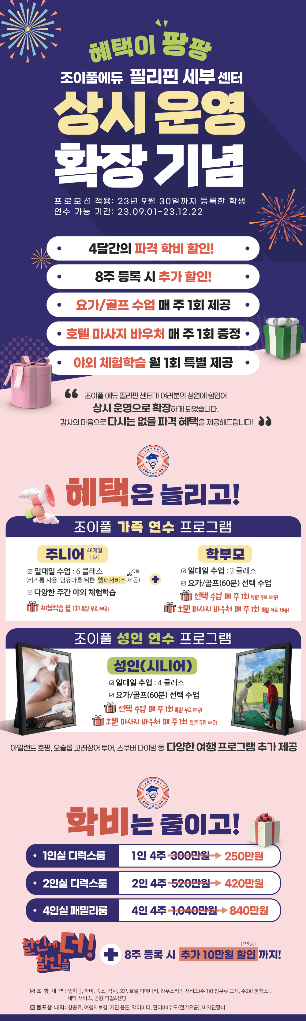 조이풀 에듀가 많은 분들의 큰 관심과 성원에 힘입어 여름/겨울 방학 가족캠프와 더불어 상시 운영으로 프로그램을 확장하게 되었습니다.
